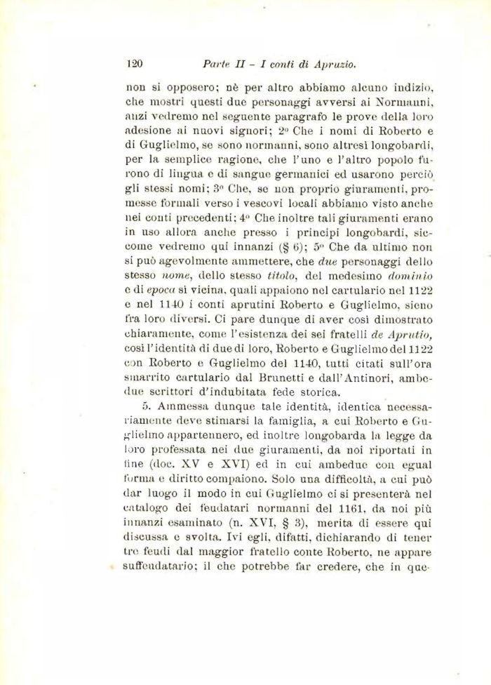 nou si opposero; nè per altro abbiamo alcuno indizio, che mostri questi due personaggi avversi ai Normanni, anzi vedremo nel seguente paragrafo le prove della loro adesione ai nuovi signori; 2 Che i nomi di Roberto e di Guglielmo, se sono normanni, sono altresì longobardi, per la semplice ragione, che l'uno e l'altro popolo furono di lingua e di sangue germanici ed usarono perciò gli stessi nomi; ?>n Che, se non proprio giuramenti, promesse formali verso i vescovi locali abbiamo visto anche nei eouti precedenti: 4 Che inoltre tali giuramenti erano in uso allora anche presso i principi longobardi, siccome vedremo qui innanzi (§ 6); ó Che da ultimo non si può agevolmente ammettere, che due personaggi dello stesso nome, dello stesso titolo, del medesimo dominio e di epoca si vicina, quali appaiono nel cartulario nel 1122 e nel 1140 i conti aprutini Roberto e Guglielmo, sieno fra loro diversi. Ci pare dunque di aver cosi dimostrato chiaramente, come l'esistenza dei sei fratelli de Aprutio, così l'identità di cluedi loro, Roberto e Guglielmodel 1122 con Roberto e Guglielmo del 1140, tutti citati sull'ora smarrito cartulario dal Brunetti e dall'Antinori, ambedue scrittori d'indubitata fede storica.
