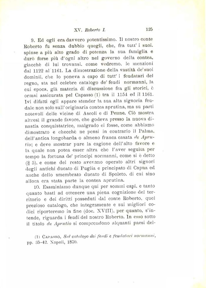 10. Esaminiamo dunque qui per sommi capi, e tanto quanto basti ad ottenere una piena cognizione del territorio e dei diritti posseduti dal conte Roberto, quel prezioso catalogo, che integramente e sui migliori codici riporteremo in fine (doc. XVIII), per quanto, s'intende, riguarda i feudi del nostro Roberto. In esso sotto il titolo de Aprutio si comprendono alquanti paesi delti) Cacasso, Su/ catalogo dei feudi e feuilatnri normanni,