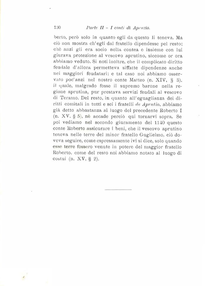 berlo, perņ solo in quanto egli da questo li teneva. Ma ciņ non mostra ch'egli dal fratello dipendesse pel resto; chņ anzi gli era socio nella contea e insieme con lui giurava protezione al vescovo aprutino, siccome or ora abbiamo veduto. Si noti inoltre, che il complicato diritto feudale d'allora permetteva siffatte dipendenze anche nei maggiori feudatari: e tal caso noi abbiamo osservato poc'anzi nel nostro conte Matteo (n. XIV, § 3), il quale, malgrado fosse il supremo barone nella regione aprutina, pur prestava servizi feudali al vescovo di Teramo. Del resto, in quanto all'eguaglianza dei diritti comitali in tutti e sei i fratelli de Aprutio. abbiamo gią detto abbastanza al luogo del precedente Roberto I (n. XV. § 5), nč accade perciņ qui tornarvi sopra. Se poi vediamo nel secondo giuramento del 1140 questo conte Roberto assicurare i beni, che il vescovo aprutino teneva nelle terre del minor fratello Guglielmo, ciņ doveva seguire, come espressamente ivi si dice, solo quando esse terre fosse.ro venute in potere del maggior fratello Roberto, come del resto noi abbiamo notato al luogo di costui (n. XV, § 2).