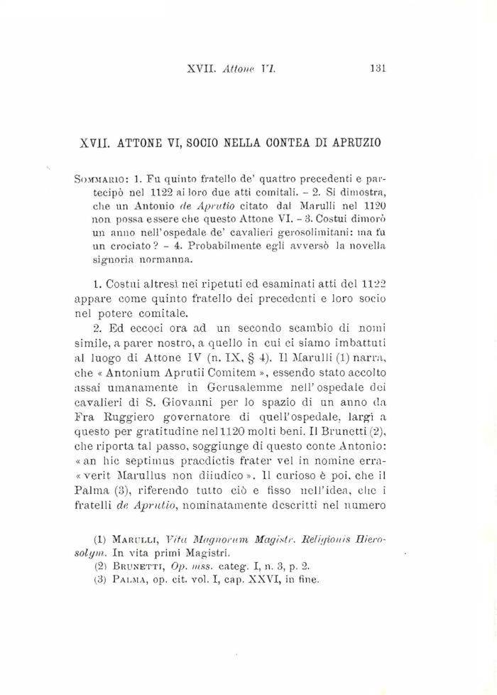 2. Ed eccoci ora ad un secondo scambio di nomi simile, a parer nostro, a quello in cui ci siamo imbattuti al luogo di Attone IV (n. IX, § 4). Il Marnili (1) narra, che « Antonium Aprutii Coinitem », essendo stato accolto assai umanamente in Gerusalemme nell'ospedale dei cavalieri di S. Giovanni per lo spazio di un anno da Fra Ruggiero governatore di quell'ospedale, largì a questo per gratitudine nel 1120 molti beni. Il Brunetti (2), che riporta tal passo, soggiunge di questo conte Antonio: « an hie septimus pracdictis frater vel in nomine erra-«verit Marullus non diiudico». 11 curioso è poi. che il Palma (3), riferendo tutto ciò e fisso nell'idea, clic i fratelli de Aprutio, nominatamente descritti nel numero