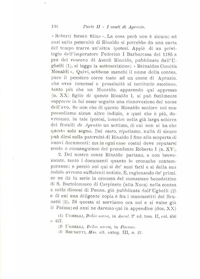 «Roberti forsan filius».La cosa però non è sicura; ed anzi sulla paternità di Rinaldo si potrebbe da una carta del tempo trarre un'altra ipotesi. Appiè di un privilegio dell'imperatore Federico I Barbarcssa del 1185 a prò del vescovo di Ascoli Rinaldo, pubblicato dall'U-ghelli (1), si legge la sottoscrizione: « Reinaldus Comitis Monaldi ». Quivi, sebbe,ne manchi il nome della contea, pure il pensiero corre tosto ad un conte di Apruzio. che avea interessi e prossimità al territorio ascolano, tanto più che nn Monaldo, apparendo qui appresso (n. XX figlio di questo Rinaldo I, si può facilmente supporre in lui esser seguita una rinnovazione del nome dell'avo. Se non che di questo Monaldo seniore noi non possediamo alcun altro indizio, e quel che è più, dovremmo. in tale ipotesi, inserire nella giù larga schiera dei fratelli de Aprutio un settimo, di cui non si ha che questo solo segno. Del resto, ripetiamo, nulla di sicuro può dirsi sulla paternità di Rinaldo I fino alla scoperta ili nuovi documenti: ma in ogni caso costui deve reputarsi erede e consanguineo del precedente Roberto I (n. XV .