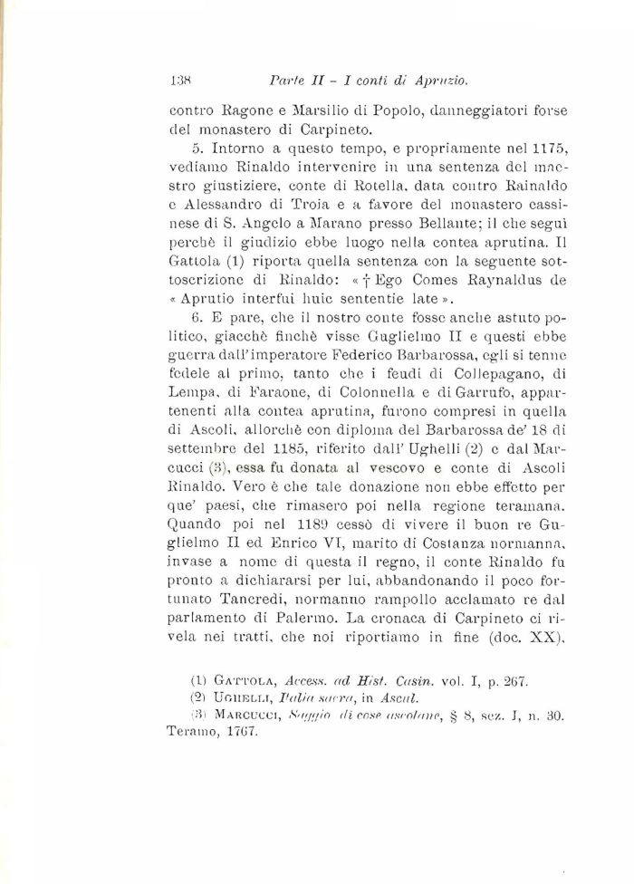 5. Intorno a questo tempo, e propriamente nel 1175, vediamo Rinaldo intervenire in una sentenza del maestro giustiziere, conte di Rotella, data contro Rainaldo e Alessandro di Troia e a favore del monastero cassi-nese di S. Angelo a Marano presso Bellante; il che segai perchè il giudizio ebbe luogo nella contea aprutina. Il Gattola (1) riporta quella sentenza con la seguente sottoscrizione di Rinaldo: « f Ego Comes Raynaldus de « Aprutio interfui huie sententie late».