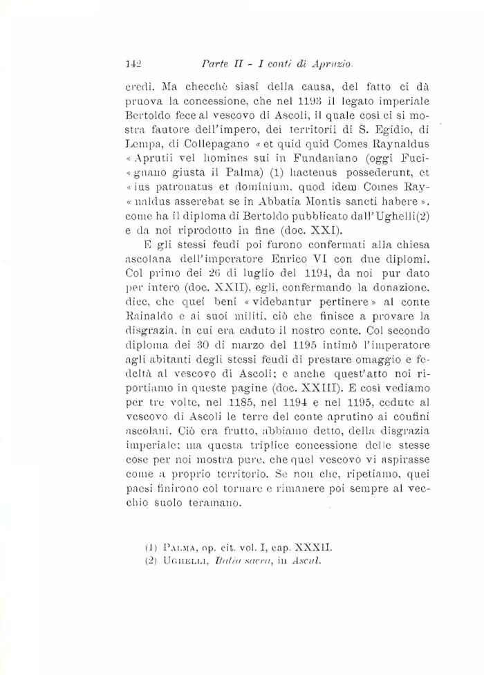 eredi. Ma checché siasi delia causa, del fatto ci dà pruova la concessione, che nel ll'J.-ì il legato imperiale Bertoldo fece al vescovo di Ascoli, il quale cosi ci si mostra fautore dell'impero, dei territorii di S. Egidio, di Lcmpa, di Collepagano « et quid quid Comes Ilaynaldus « Aprutii vel homines sui in Fundaniano (oggi Fuci-« guano giusta il Palma) (1) hactenus possederunt, et « ius patrouatus et dominium. quod idem Comes Ray-« naldus asserebat se in Abbatia Montis sancti habere ». come ha il diploma di Bertoldo pubblicato dall'Ughelli(2) e da noi riprodotto in fine (doc. XXI).