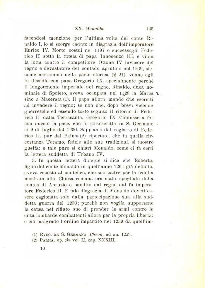 facendosi menzione per l'ultima volta del conto Rinaldo I. io si scorge caduto in disgrazia dell'imperatore Enrico IV. Morto costui nel 1197 e successogli Federico II sotto la tutela di papa Innocenzo III, e vinta la lotta contro il competitore Ottone IV invasore de.l regno e devastatore del contado aprutino nel 1209, siccome narrammo nella parte storica (i? 21), venne egli in dissidio con papa Gregorio IX, specialmente perchè il luogotenente, imperiale nel regno, Rinaldo, duca nominale di Spoleto, aveva occupata nel 1128 la Marca z ¦ sino a Macerata (1). Il papa allora mandò due eserciti ad invadere il regno; se non che, dopo brevi vicende guerresche ed essendo tosto seguito il ritorno di Federico Il dalla Terrasanta, Gregorio IX s'indusse a far con questo la pace, che fu sottoscritta in S. Germano ai !> di luglio del 12.->0. Sappiamo dal registro di Federico II, pur dal Palma (2) riportato, che in quella circostanza Teramo, fedele, alle sue tradizioni, si mostrò guelfa: e tale pure si chiarì Monaldo, come ci fa certi la lettera suddetta di Urbano IV.