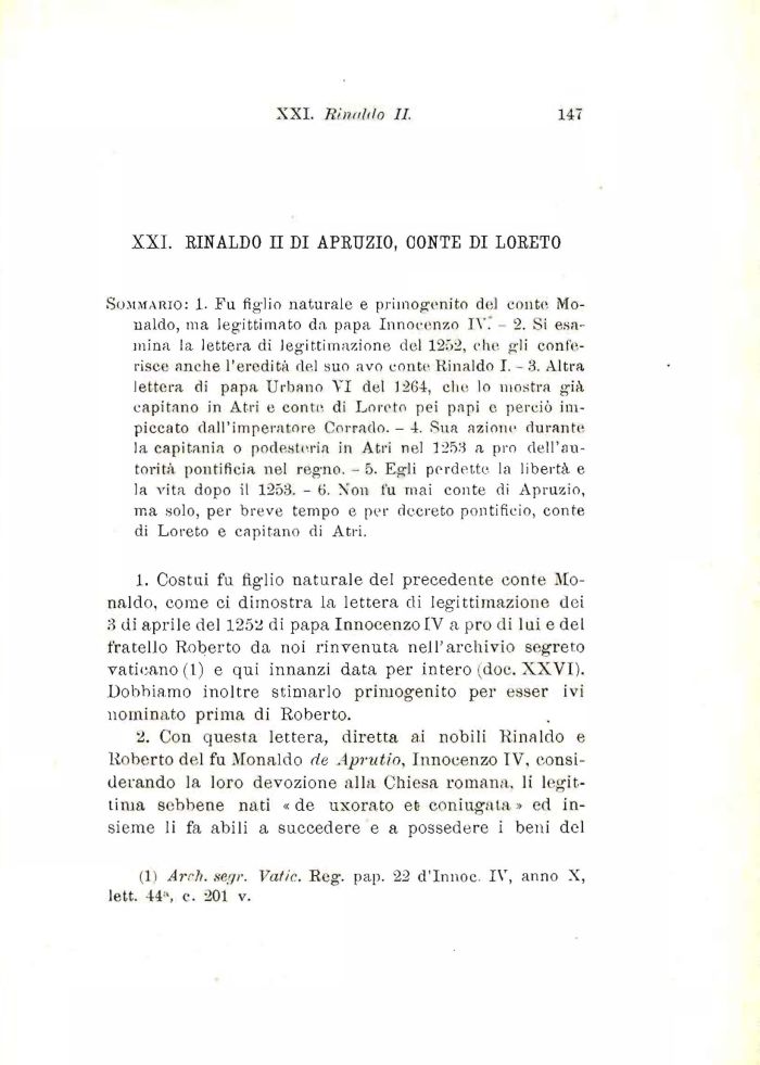 Sommario: 1. Fu figlio naturale e primogenito del eonte. Monaldo, ma legittimato da papa Innocenzo IV. ¦ 2. Si esamina la lettera di legittimazione del 1252, ohe gli conferisce anche l'eredità del suo avo conte Rinaldo I. - 3. Altra lettera di papa Urbano VI del 1264, che. lo mostra già capitano in Atri c conte, di Loreto pei papi c perciò impiccato dall'imperatore Corrado. - 4. Sua azione durante la capitania o podesteria in Atri nel 1253 a prò dell'autorità pontificia nel regno. - 5. Egli perdette, la libertà e la vita dopo il 1253. - 6. Non Cu mai conte di Apruzio, ma solo, per breve tempo e per decreto pontificio, conte di Loreto e capitano di Atri.