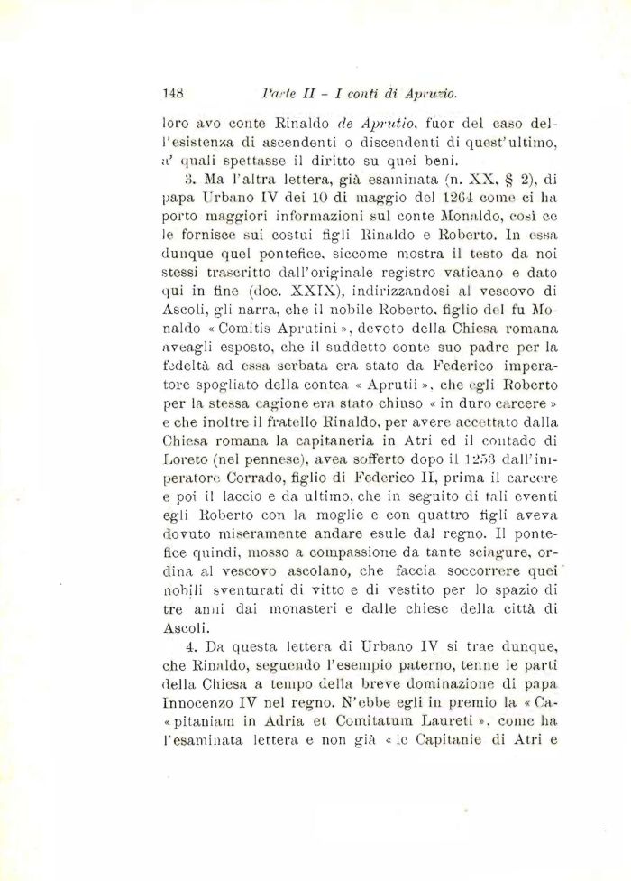 ;-!. Ma l'altra lettera, già esaminata (n. XX, § 2), di papa Urbano IV dei 10 di maggio del 1264 come, ci lui porto maggiori informazioni sul conte Monaldo, cosi ce le fornisce sui costui figli Rinaldo e Roberto. In essa dunque quel pontefice, siccome mostra il testo da noi stessi trascritto dall'originale registro vaticano e dato qui in fine (doc. XXIX), indirizzandosi al vescovo di Ascoli, gli narra, che il nobile Roberto, figlio del fu Monaldo « Comitis Aprutini », devoto della Chiesa romana aveagli esposto, che il suddetto conte suo padre per la fedeltà ad essa serbata era stato da Federico imperatore spogliato della contea « Aprutii », che egli Roberto per la stessa cagione er;i slato chiuso « in duro carcere » e che inoltre il fratello Rinaldo, per avere accettato dalla Chiesa romana la capitaneria in Atri ed il contado di Loreto (nel pennese), avea sofferto dopo il 1253 dall'imperatore. Corrado, figlio di Federico II, prima il carcere e poi il laccio e da ultimo, che in seguito di tali eventi egli Roberto cori la moglie e con quattro tìgli aveva dovuto miseramente andare esule dal regno. II pontefice quindi, mosso a compassione da tante sciagure, ordina al vescovo ascolano, che faccia soccorrere quei nobili sventurati di vitto e di vestito per lo spazio di tre anni dai monasteri e dalle chiese della città di Ascoli.