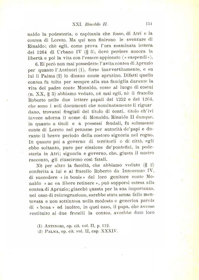 6. Ei però non mai possedette l'avita contea di Apruzio per quanto l'Antinori (1), forse inavvertitamente, e su lui il Palma (2) lo dicano conte aprutino. Difatti quella contea fu tolta per sempre alla sua famiglia durante la vita del padre conte Monaldo, come al luogo di costui (n. XX, t; 3) abbiamo veduto, uè mai egli, nò il fratello Roberto nelle due lettere papali del 1252 e del 1261. che sono i soli documenti che nominatamente lì riguar dano, trovansi fregiati del titolo di conti, titolo ch'ivi invece adorna il nome di Monaldo. Rinaldo II dunque, in quanto a titoli e a possessi feudali, fu solamente conte di Loreto nel pennese per autorità de'papi e durante il breve periodo della costoro signoria nel regno. In quanto poi a governo di territorii o di città, egli ebbe soltanto, pure per elezione de'pontefici, la podesteria in Atri; signoria e governo, che, giusta il nostro racconto, gli riuscirono cosi fatali.