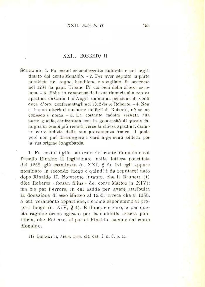 1. Fu costui figlio naturale del conte Monaldo e. col fratello Rinaldo II legittimato nella lettera pontificia del 1252, già esaminata (n. XXI, § 2). Ivi egli appare nominato in secondo luogo e quindi è da reputarsi nato dopo Rinaldo II. Noteremo intanto, che il Brunetti (1) dice Roberto « f'orsau filius» del conte Matteo (n. XIV): ma ciò per l'errore, in cui cadde per avere attribuita la donazione di esso Matteo al 1250, invece che ni 1150, a cui veramente appartiene, siccome esponemmo al proprio luogo (n. XIV, § 4). È dunque sicuro, e per questa ragione cronologica e per la suddetta lettera pontificia, che Roberto, al par di Rinaldo, nacque dal conte. Monaldo.