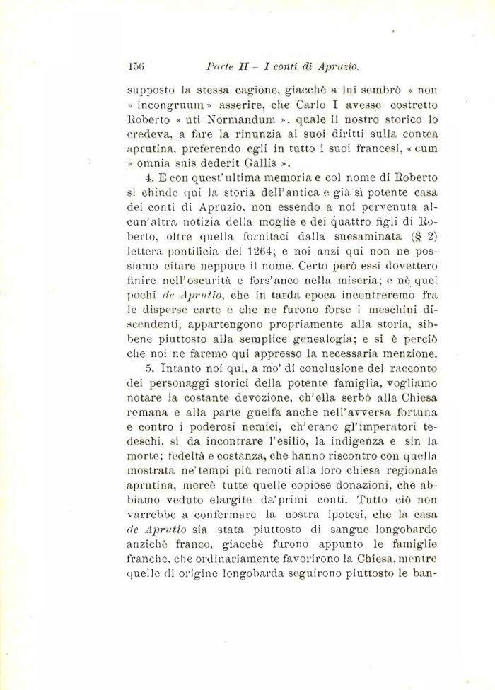 4. E con quest'ultima memoria e col nome di Roberto si chiude qui la storia dell'antica e già sì potente casa dei conti di Apruzio, non essendo a noi pervenuta al-cun'altra notizia della moglie e dei quattro figli di Roberto, oltre quella fornitaci dalla suesaminata 2) lettera pontificia del 1264; e noi anzi qui non ne possiamo citare neppure il nome. Certo però essi dovettero finire nell'oscurità e fors'anco nella miseria; e nò quei pochi (h' Aprutio, che in tarda epoca incontreremo fra le disperse carte e che ne furono forse i meschini discendenti, appartengono propriamente alla storia, sib-bene piuttosto alla semplice genealogia; e si è perciò che noi ne faremo qui appresso la necessaria menzione.