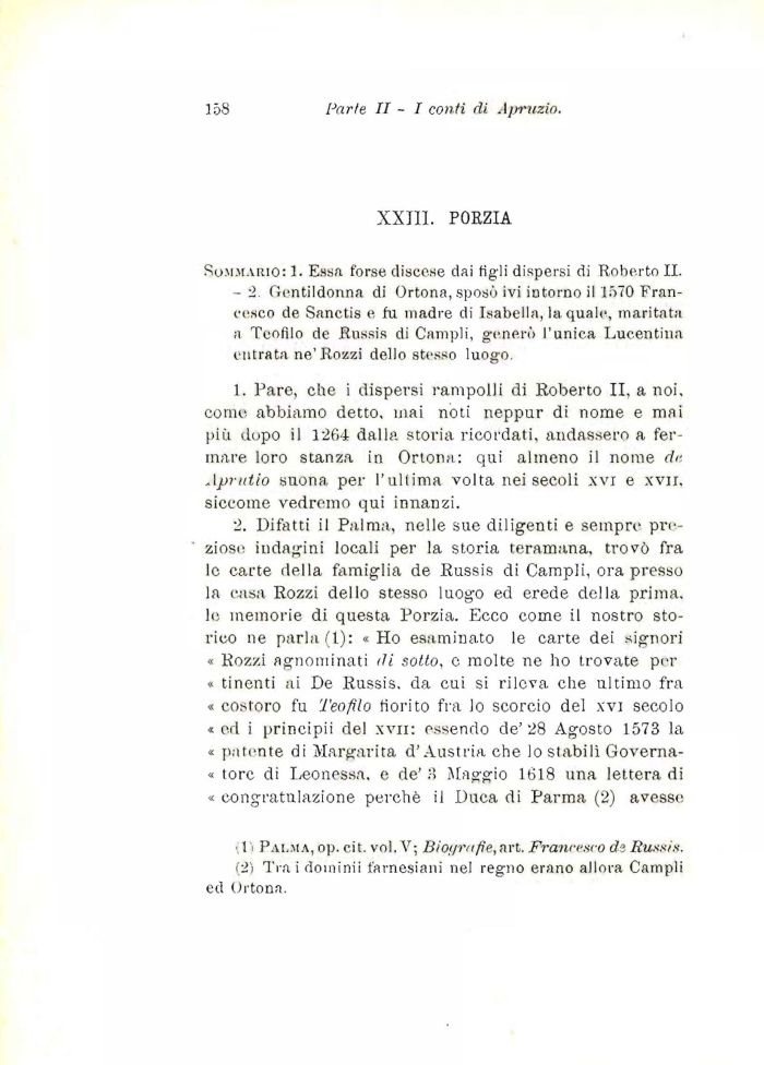 2. Difatti il Palma, nelle sue diligenti e sempre preziose indagini locali per la storia teramana, trovò fra le carte della famiglia de Russis di Campii, ora presso la casa Rozzi dello stesso luogo ed erede della prima, le memorie di questa Porzia. Ecco come il nostro storico ne parla (1): «Ho esaminato le carte dei signori « Rozzi agnominati di sotto, e molte ne ho trovate per « tinenti ai De Russis. da cui si rileva che ultimo fra « costoro fu Teofilo fiorito fra lo scorcio del xvi secolo « ed i principii del xvxi: essendo de' 28 Agosto 1573 la « patente di Margarita d'Austria che lo stabili Governa-« torc di Leonessa, e de' 3 Maggio 1618 una lettera di « congratulazione perchè il Duca di Parma (2) avesse