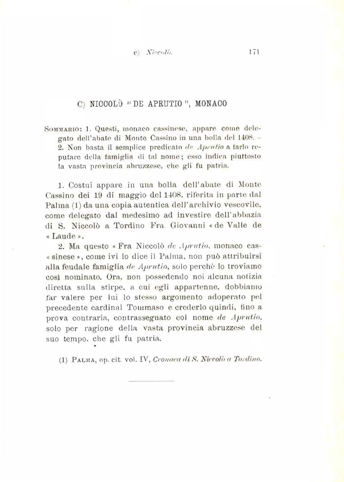 2. Ma questo «Fra Niccolò de Aprati», monaco cns-«sinese», come ivi lo dice il Palma, non può attribuirsi alla feudale famiglia dr. Aprutio, solo perchè Io troviamo così nominato. Ora. non possedendo noi alcuna notizia diretta sulla stirpe, a cui egli appartenne, dobbiamo far valere per lui lo stesso argomento adoperato pel precedente cardinal Tommaso e, crederlo quindi, lino a prova contraria, contrassegnato col nome de Aprutin. solo per ragione della vasta provincia abruzzese del suo tempo, che gli fu patria.