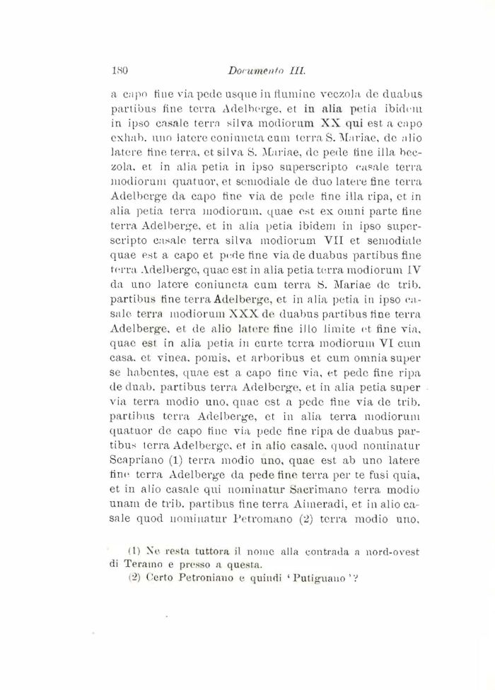 a capo fine via pedo usque in flumine veczola de dualius par ti bus fine terra Adelherge. et in alia petia ibidem in ipso casale terra silva modiorum XX qui est a capo cxhab. uno latore coniuncta cum terra S. Mariae, de alio latore fine terra, et silva S. Mariae, de pede line il la. beccola. et in alia petia in ipso superscripto casale terra modiorum quatuor, et seniodiale de duo latere fine terra Adelbcrge da capo fine via de pede fine illa ripa, et in alia petia terra modiorum. quae est ex ornili parte fine terra Adelberge. et in alia petia ibidem in ipso super-scripto casale terra silva modiorum VII et semodiale quae est a capo et pe.de fine viadeduabus partibusflne ferra Adelberge, quae est in alia petia terra modiorum IV eia uno latere coniuncta cum terra iS. Mariae de trib. partibus fine terra Adelberge, et in alia petia in ipso ca sale terra modiorum XXX de duabus partibus fine terra Adelberge, et de alio latere fine ilio limite et fine via, quae est in alia petia in enrte terra modiorum VI cum casa, et vinea. poiuis, et arboribus et cum omnia super se habentes, quae est a capo fine via, et pede fine ripa de duali, partibus terra Adelbcrge. et in alia petia super via terra modio uno, quae est a pede fine via de trib. partibus terra Adelberge, et in alia terra modiorum quatuor de capo fine via pedo fine ripa de duabus partibus terra Adelberge, et in alio casale, quocl nominatur Scapriano (1) terra modio uno, quae est ab uno latere line terra Adelberge da pede fine terra per te fusi quia, et in alio casale qui nominatur Sacrimano terra modio unani de trib. partibus fine terra Aiineradi, et in alio casale quod nominatur Petroniano (2) terra modio uno,