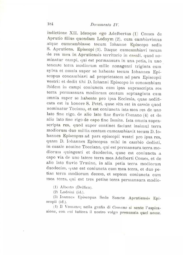 indictione XII. ldeoque ego Adelbertus (1) Comes de Aprutio filius quondam Lodoym (2), cum cambiavimus atque cumcambiasse tecum Iohanne Episcopo sedis S. Aprutiens. Episcopi (8). Itaque cumcambiavi tecum de res luca in Aprutiensis territorio in casali, quod no-minatur campi, qui est permansura in una petia, in uno tenente terra modioruin mille nonagenti triginta cum sylva et omnia super se habente tecum lohannes Epi-scopus concambiavi ad proprietatem ad pars Episcopii vestri: et dedit tibi D. Iohanni Episcopo in concambium ibidem in campi coniuncta cum ipsa suprascripta res terra permansura modiorum centum septuaginta cum omnia super se habente pṛ ipsa Ecclesia, quae aedifi-cata est in honore S. l'etri, quae sita est in casale quod noininatur Tociano, et est coniuncta ista mea res de uno lato fine rigo, de alio lato fine fluvio Coniano (4) et de alio Iato line, rigode capo fine Ismite. [sta omnia suprascripta res, quod super continet faciunt insimul terra modiorum duo millia centum eumeambiavit tecum D. lohannes Episcopus ad pars episcopii vestri pṛ ipsa res, quam D. lohannes Episcopus mihi in cambio cledisti, in casale nomine Tocciano, qui est permansura terra modiorum quingenti et duodecim, quae est coniuncta a capo via de uno latere terra mea Adelberti Comes, et de alio lato tluvio Trutino, in alia petia terra modioruin duodecim, qaae est coniuncta cum mea terra, et duo pe-tiac terra modiorum decem, et septem coniuncta cum mea terra, qui est tres petiae terra permansura ́nodio-