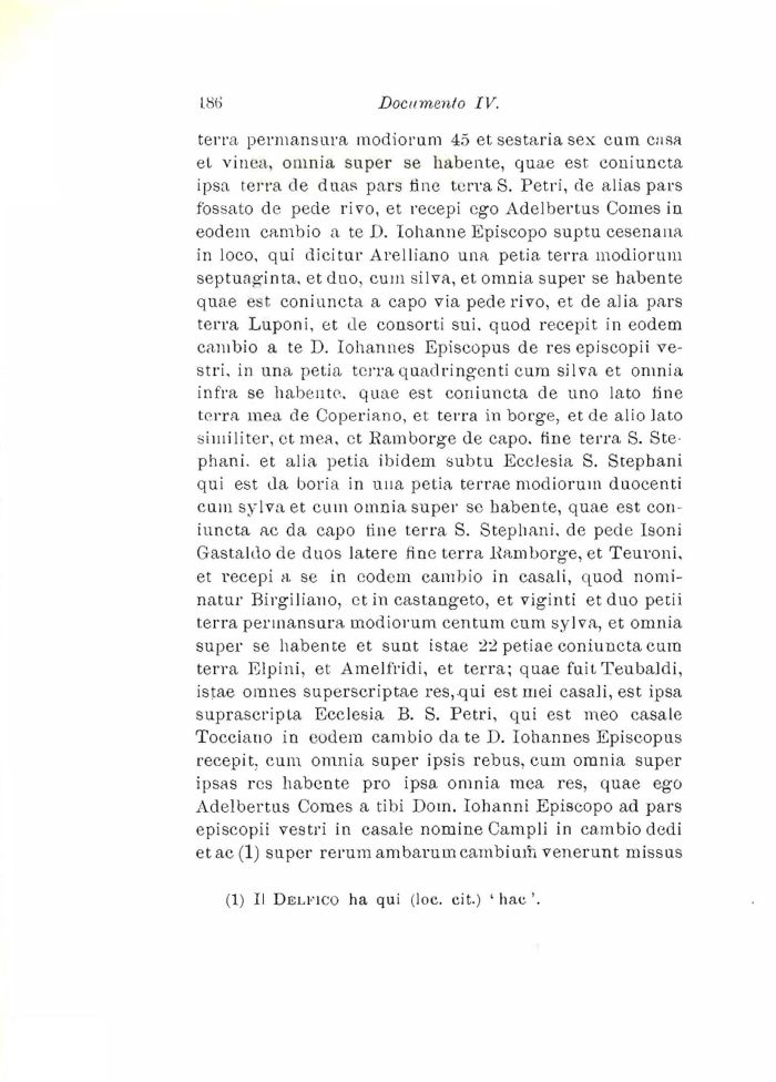 terra permansala modiorum 45 et sestaria sex cura casa et vinca, omnia super se habente, quae est coniuncta ipsa terra de duas pars tine terra S. Peti'i, de alias pars fossato de pede rivo, et recepì ego Adelbertus Comes in eodem cambio a te I). Iohanne Episcopo suptu cesenana in loco, qui dicitar Arelliano una petia. terra modiorum septuno-inta, et duo, cum Silva, et omnia super se babente quae est. coniuncta a capo via pede rivo, et de alia pars terra Luponi, et de consorti sui. quod recepit in eodem cambio a te D. Iohannes Episcopus de resepiscopii ve-stri, in una petia terraquadfingenti cum Silva et omnia infra se babente. quae est coniuncta de uno lato line terra mea de Coperiano, et terra in borge, et de alio lato similiter, et mea, et Pam borge de capo, tine terra S. Ste-phani. et alia petia ibidem subtu Ecclesia S. Stepbani qui est da boria in una petia terrae modiorum duocenti cum sylva et cum omnia super se babente, quae est coniuncta ac da capo tine terra S. Stepliani. de pede Isoni Gastaldo de duos latere fine terra Pam borge, et Teuroni, et recepi a se in eodem cambio in casali, quod nomi-natur Birgiliano, etili castaageto, et vigiliti et duo petii terra permansura modiorum centum cum sylva, et omnia super se habente et suut istae 22 petiae coniuncta cum terra Elpini, et Amelfridi, et terra; quae fuit Teubaldi, istae oranes superscriptae res, qui est mei casali, est ipsa suprascripta Ecclesia B. S. Petri, qui est meo casale Tocciano in eodem cambio da te D. Iohannes Episcopus recepit. cum omnia super ipsis rebus, cum omnia super ipsas rcs habente prò ipsa omnia mea res, quae ego Adelbertus Comes a tibi Doin. Iolianni Episcopo ad pars episcopii vestri in casale nomine Campii in cambio dedi etac (1) super rerum ambaruin cambiuiiì venerunt missus