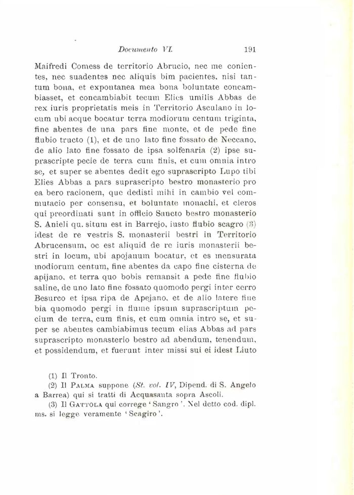 Maifredi Comess de territorio Abrucio, nec me conien-tes, nec suadentes nec aliquis bim pacientes. nisi tantum bona, et expoutanea mea bona boi un tate concam-biasset, et concambiabit tecum Elies umilis Abbas de rex iuris proprietatis meis in Territorio Ascalano in lo-cum ubi acque bocatur terra modiorum centum triginta, fine abentes de una pars fine monte, et de pede fine flubio tructo (1), et de uno lato fine fossato de Meccano, de alio lato fine fossato de ipsa solfenaria (2) ipse su-prascripte pecie de terra cum finis, et cani omnia intro se, et super se abentes dedit ego suprascripto Lupo tibi Elies Abbas a pars suprascripto bestro monasterio pṛ ea bero racionem, que dedisti mihi in cambio vel com-mutacio per consensu, et boluntate monachi, et cleros qui preordinati sunt in officio Sancto bestro monasterio S. Anieli qu. situili est in Barrejo. iusto tlubio scagro .'!) idest de re vestris S. monasteri bestri in Territorio Abrucensum, oc est aliquid de re iuris monasterii bestri in locutn, ubi apo.janum bocatur, et es inensurata modiorum centum, fine abentes da capo fine cisterna de apijano, et terra quo bobis remansit a pede fine fiubio saline, de uno lato fine fossato quomodo pergi inter ccrro Besurco et ipsa ripa de Apeja.no, et de alio latere fine bia quomodo pergi in fiume ipsum suprascriptuin pc-cium de terra, cum finis, et cum omnia intro se, et super se abentes cambiabimus tecum elias Abbas ad pars suprascripto monasterio bestro ad abendum, tenendum, et possidendum, et fuerunt inter missi sui ei idest làuto