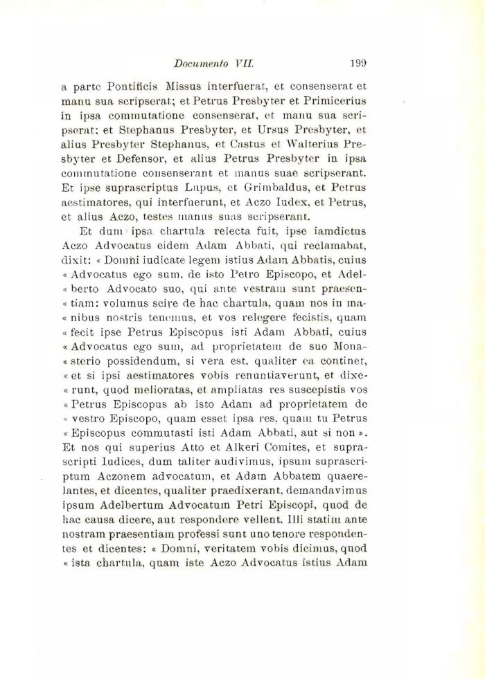 a parte Pontifici* Missus interfuerat, et consenserat et manu sua scripserat; et Petrus Presbyfer et Primicerius in ipsa eonunutatione consenserat, et manu sua scripserat; et Stephanus Presbyter, et Ursus Presbyter, et alius Presbyter Stephanus, et Castus et Walterius Presbyter et Defensor, et alius Petrus Presbyter in ipsa cominutatione consenserant et manus suae scripserant. Et ipse suprascriptus Lupus, et Grimbaldus, et Petrus aestimatores, qui interfuerunt, et Aczo Iudex, et Petrus, et alius Aczo, testes manus suas scripserant.