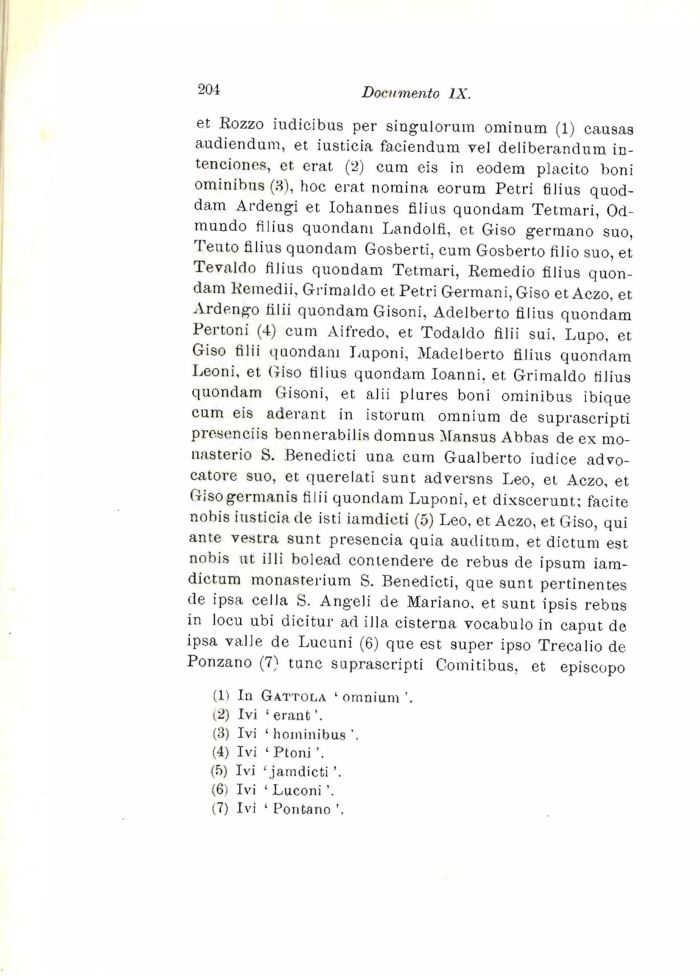 et Rozzo iudicibus per singulorum ominum (1) causas audiendum, et iustieia faciendum vel deliberandum in-tenciones, et erat (2) cum eis in eodem placito boni ominibus (3), hoc erat nomina eorum Petri filius quod-dam Ardengi et Iohannes filius quondam Tetmari, Od-mundo filius quondam Landolfi, et Giso germano suo, Tento filius quondam Gosberti, cum Gosberto filio suo, et Tevaldo filius quondam Tetmari, Remedio filius quondam Remedii, Grimaldo et Petri Germani,Giso et Aczo, et Ardengo tilii quondam Gisoni, Adelberto filius quondam Pertoni (4) cum Aifredo, et Todaldo filii sui, Lupo, et Giso tilii quondam Luponi, Madelberto filius quondam Leoni, et Giso filius quondam Ioanni. et Grimaldo tėlius quondam Gisoni, et alii plures boni ominibus ibique cum eis aderant in istorum omnium de suprascripti presenciis bennerabilis dornnus Mansus Abbas de ex monasterio S. Benedicti una cum Gualberto iudice advo-catore suo, et querelati sunt adversns Leo, et Aczo, et Gisogermanis filii quondam Luponi, et dixscerunt; facite nobis iustieia de isti iamdicti (5) Leo. et Aczo, et Giso, qui ante vestra sunt presencia quia auditum, et dictum est nobis ut illi bolead contendere de rebus de ipsum iam-dictum monasterium S. Benedicti, que sunt pertinentes de ipsa cella S. Angeli de Mariano, et sunt ipsis rebus in locu ubi dicitur ad illa cisterna vocabulo in caput de ipsa valle de Lucuni (6) que est super ipso Trecalio de Ponzano (7) tunc suprascripti Comitibus, et episcopo