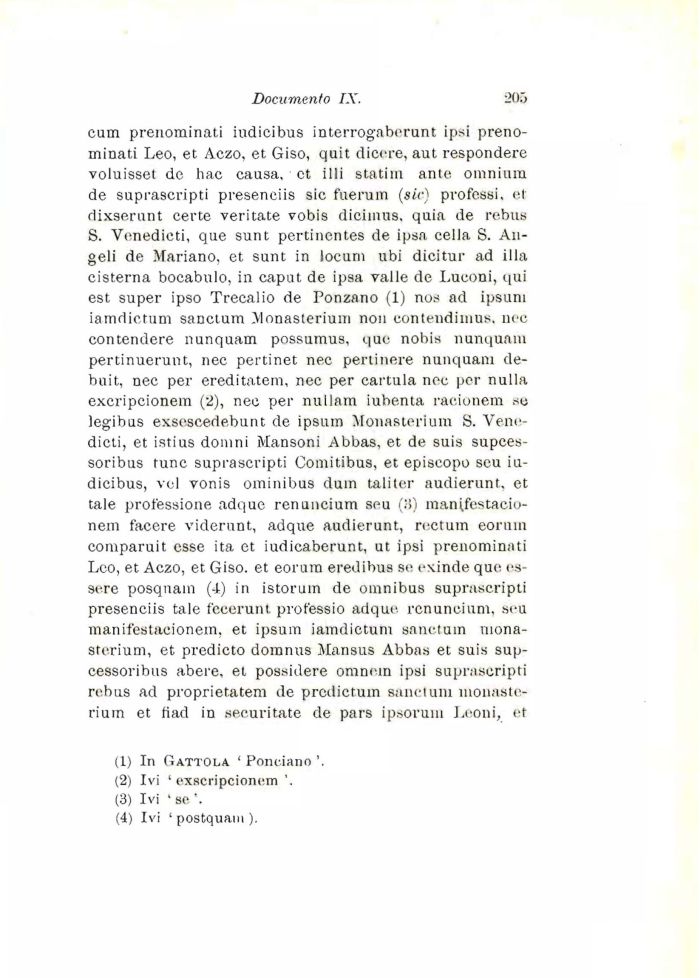 cum prenominati iudicibus interrogaberunt ipsi prenominati Leo, et Ączo, et Giso, quit dicere, aut respondere voluisset de hac causa, et illi statini ante omnium de suprascripti preseneiis sic fuerum (sic) professi, et dixserunt certe veritate vobis dicimus, quia de rebus S. Venedieti, que sunt pertinentes de ipsa cella S. Angeli de Mariano, et sunt in locurn ubi dicitur ad illa cisterna bocabulo, in caput de ipsa valle de Luconi, qui est super ipso Trecalio de Ponzano (1) nos ad ipsum iamdictum sanctum Monasterium non eonteiidimus, nec contendere nunquam possumus, quo nobis nunquam pertinuerunt, nec pertinet nec pertinere nunquam de-buit, nec per ereditatem, nec per cartula nec per nulla excripcionem (2), nec per nullam iubenta racionem so legibus exsescedebunt de ipsum Monasterium S. Veno-dicti, et istius doinni Mansoni Abbas, et de suis supees-soribus tunc suprascripti Comitibus, et episcopo seu iudicibus, vel vonis ominibus duin tali ter audierunt. et tale professione adque renuncium sou (8) mantfestacio-nem facere viderunt, adque audierunt, rectum eorum comparuit esse ita et iudicaberunt, ut ipsi prenominati Leo, et Aczo, et Giso. et eorum eredibus se exinde que essere posqnam (-4) in istorum de omnibus suprascripti preseneiis tale fccerunt professio adque renuncium, seu manifestacionem, et ipsum iamdictum sanctum monasterium, et predicto domnus Mansus Abbas et suis sup-cessoribus abere, et possidere omncin ipsi suprascripti rebus ad proprietatem de predictuin sanctum monasterium et fiad in securitate de pars ipsorum Leoni, et