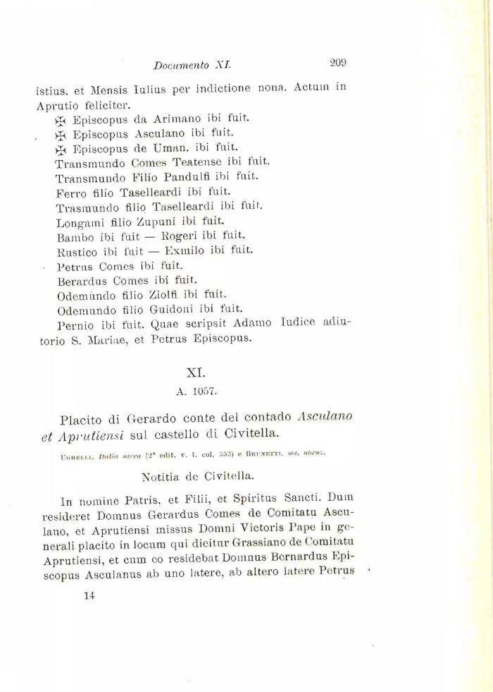 In nomine Patris, et Filii, et Spiritus Sancii. Dum resideret Domnus Gerardus Comes de Comi tatů Asculano, et Aprutiensi missus Domni Victoris Pape in generali placito in locum qui dicitnr Grassiano de Comitatu Aprutiensi, et cum co residebat Domnus Bcrnardus Episcopus Asculanus ab uno latere, ab altero latore Petrus