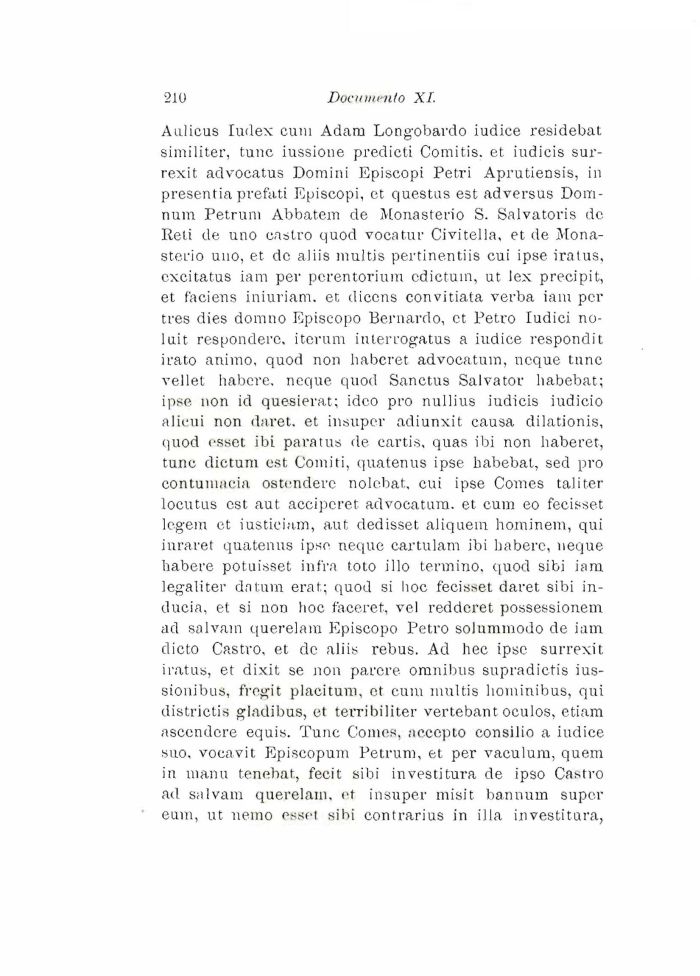 Aulicus ludex cum Adam Longobardo iudice residebat similiter, tunc iussione predicti Comitis. et iudicis sur-rexit advoeatus Domini Episcopi Petri Aprutiensis, in presentia prefati Episcopi, et questua est adversus Dom-num Petrum Abbatem de Monasterio S. Salvatoris de Reti de uno castro quod vocatur Civitella, et de Monasterio uno, et de aliis multis pertinentiis cui ipse iratus, cxcitatus iam per perentorium cdictuin, ut lex precipit, et f'aciens iniuriam. et dicens convitiata verba iam per tres dies donino Episcopo Bernardo, et Petro ludici no-1 ait respondere, iterum interrogatus a iudice respondit irato animo, quod non haberet advocatum, ncque tunc vellet liabcre, neque quod Sanctus Salvator habebat; ipse non id quesierat; ideo prņ nullius iudicis iudicio alieni non daret, et insuper adiunxit causa dilationis, quod csset ibi paratus de cartis, quas ibi non haberet, tunc dictum est Corniti, quatenus ipse habebat, sed prņ contumacia ostenderc nolebat, cui ipse Comes taliter locutus est aut aeciperet advocatum. et cum eo fecisset legem et iusticiam, aut dedisset aliquem hominem, qui inraret quatenus ipse neque cartulam ibi habere, neque habere potuisset infra toto ilio termino, quod sibi iam legaiiter dntum erat; quod si hoc fecisset daret sibi in-ducia, et si non hoc faceret, vel redderet possessionem ad salvam querelala Episcopo Petro solummodo de iam dicto Castro, et de aliis rebus. Ad hec ipso surrexit iratus, et dixit se non parere omnibus supradictis ius-sionibus, fregit placitum, et cum multis liominibus, qui districtis gladibus, et terribiliter vertebant oculos, etiam ascendere equis. Tunc Comes, accepto Consilio a iudice suo, vocavit Episcopum Petrum, et per vaculum, quem in manu tenebat, fecit sibi investitura de ipso Castro ad salvam querelam, et insuper misit bannum super eum, ut neino esse! sibi contrarius in illa investitura,