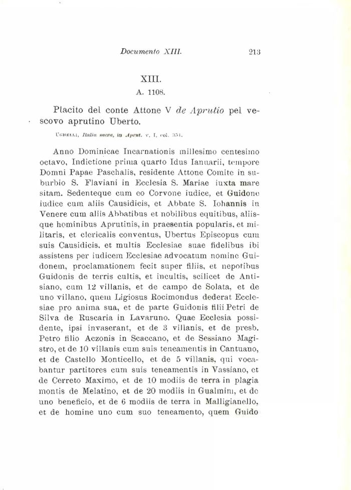 Anno Dominicae Incarnationis millesimo centesimo oclavo, Indictione prima quarto Idus Ianuarii, tempore Domni Papae Paschalis, residente Attone Comite in suburbio S. Flaviani in Ecclesia S. Mariae iuxta mare sitam. Sedenteque cum eo Corvone iudice, et Guidone iudiee cum aliis Causidicis, et Abbate S. Iohannis in Venere cum aliis Abbatibus et nobilibus equitibus, aliis-que hominibus Aprutinis, in praesentia popularis, et mi-li taris, et clericalis conventus, Ubertus Episcopus cum suis Causidicis, et multis Ecclesiae suae fidelibus ibi assistens per iudicem Ecclesiae advocatum nomine Gui-donem, proclamationem fecit super těliis, et nepotibus Guidonis de terris cultis, et incultis, scilicet de Anti-siano, cum 12 villanis, et de campo de Solata, et de uno villano, quem Ligiosus Rocimondus dederat Ecclesiae prň anima sua, et de parte Guidonis tilii Petri de Silva de Ruscaria in Lavaruno. Quae Ecclesia possidente, ipsi invaserant, et de 3 villanis, et de presb. Petro tělio Aczonis in Scaccano, et de Sessiano Magi-stro, et de 10 villanis cum suis teneamentis in Cantuano, et de Castello Monticello, et de 5 villanis, qui voca-bantur partitores cum suis teneamentis in Vassiano, et de Cerreto Maximo, et de 10 modiis de terra in plagia montis de Melatino, et de 20 modiis in Gualmini, et de uno beneficio, et de 6 modiis de terra in Malligianello, et de homine uno cum suo tenearaento, quem Giudo