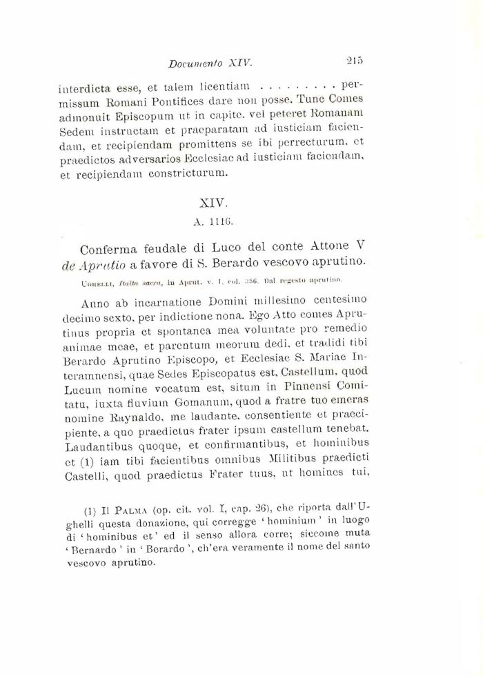 Anno ab incarnatone Domini millesimo centesimo decimo sexto, per indictione nona. Ego Atto comes Aprii-tinus propria et spontanea mea voluntate prò remedio animae meae, et parcntuin meoruiu dedi, et tradidi tibi Berardo Aprutino Episcopo, et Ecclesiae S. Mariae In-teramnensi, quae Sedes Episcopatus est, Castellum. quod Lucuin nomine vocatum est, situm in Pinnensi Comi-tatù, iuxta tiuviuin Gomanum, quod a fratre tuo eineras nomine Ruynaldo, me laudante, consentiente et praeci-piente, a quo praedictus frater ipsum castellum tenebat. Laudantibus quoque, et conlìrmantibus, et hoininibus et (1) iam tibi facientibus omnibus Militibus praedicti Castelli, quod praedictus Frater tuus. ut liomiues tui,