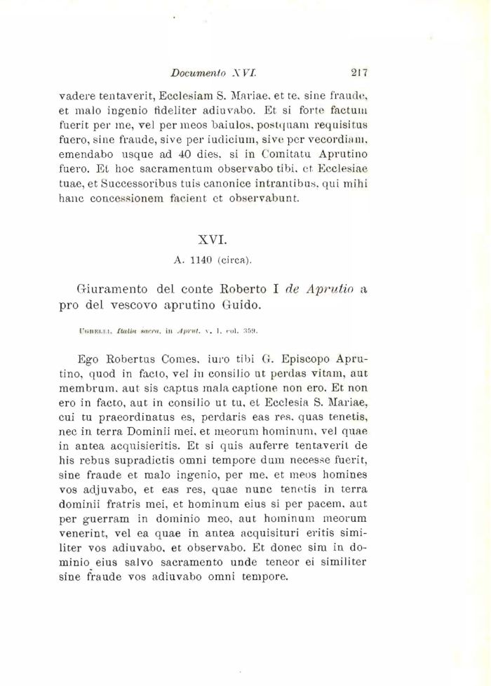 Ego Robertus Comes, iuro tibi G. Episcopo Aprutino, quod in facto, vel ili Consilio ut perdas vitam. aut membrum. aut sis captus malacaptione non ero. Et non ero in facto, aut in Consilio ut tu, et Ecclesia S. Mariae, cui tu praeordinatus es, perdaris eas res. quas tenetis, nec in terra Dominii mei, et meorum hominum, vel quae in antea acquisieritis. Et si quis auferre tentaverit de his rebus supradictis omni tempore dum necesse fuerit, sine fraude et malo ingenio, per me, et meos homines vos adjuvabo, et eas res, quae nunc tenetis in terra dominii fratris mei, et hominum eius si per pacem. aut per guerram in dominio meo, aut hominum meorum venerint, vel ea quae in antea acquisituri eritis simi-liter vos adiuvabo, et observabo. Et donec sim in dominio eius salvo sacramento unde teneor ei similiter sine fraude vos adiuvabo omni tempore.