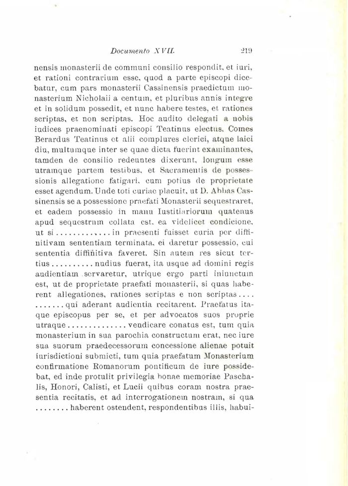 nensis monasterii de communi Consilio respondit, et iuri, et rationi contrarium esse, quod a parte episcopi dice-batur, cum pars monasterii Gassinensis praedictum 1110-nasterium Nicholaii a centum, et pluribus annis integre et in solidum possedit, et nunc habere testes, et rationes scriptas, et non scriptas. Hoc audito delegati a uobis iudices praenominati episcopi Teatinus electus. Comes Berardus Teatinus et alii complures clerici, atque laici diu, multumque inter se quae dieta fuerint examinantes, tamderi de Consilio redeuntes dixerunt, longum esse utramque partem testibus, et Sacrameli tis de posses-sionis allegatione fatigari. cum potius de proprietate esset agendum. Unde toti curiae placuit, ut D. Ahlms Gassinensis se a possessione praefati Monasterii sequestraret, et eadem possessio in manu Iustitiarioruin quatenus apud sequestrimi collata est. ea videlicet condicione, ut si.......... ...in praesenti fuisset curia per dittili iti vam sententiam terminata, ei daretur possessio, cui sententia diffinitiva faveret. Sin autein res sicut ter-