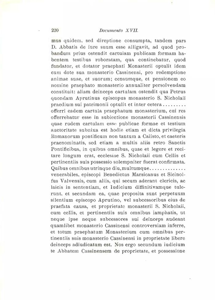 venerabiles, episcopi Benedictus Marsicanus et Sicinol-fus Valvensis, cum aliis, qui secum aderant clericis, ac laicis in sententiam, et Iudicium diffinitivamque tule-runt, et secundam ea, quae proposita sunt perpetuum silentium episcopo Aprutino, vel subeessoribus eius de praefata causa, et proprietatc. monasterii S. Nicholaii, cum cellis, et pertinentiis suis omnibus iamphatis, ut neque ipse neque subeessores sui deinceps audeant quamlibet monasterio Cassinensi controversiam inferre, et totum praephatum Monasterium cum omnibus pertinentiis suis monasterio Cassinensi in proprietate libere deinceps adiudicatum est. Nos ergo secundum iudicium te Abbatem Cassinensem de proprietate, et possessione