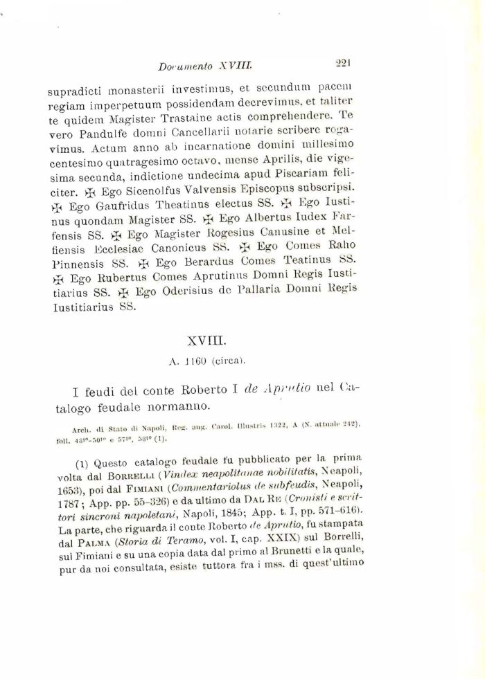 (1) Questo catalogo feudale fu pubblicato per la prima volta dal Boriiklli (Vindex neapolitnnae nubili/atti, Scapoli, 165;!), poi dal Fimi ani (Comme.ntariolus de subfeudis, Xeapoli, 1787 ; App. pp. 55-326) e da ultimo da Dal Ri-: (Cronisti e scrittori sincroni napoletani, Napoli, 1845; App. t. I, pp. 571-616). La parte, che riguarda il conte Roberto de Aprutio, fu stampata dal Palma (Storia di Teramo, voi. I, cap. XXIX) sul Borrelli, sul Fimiani e su una copia data dal primo al Brunetti e, la quale, pur da noi consultata, esiste tuttora, fra i mss. di quest'ultimo