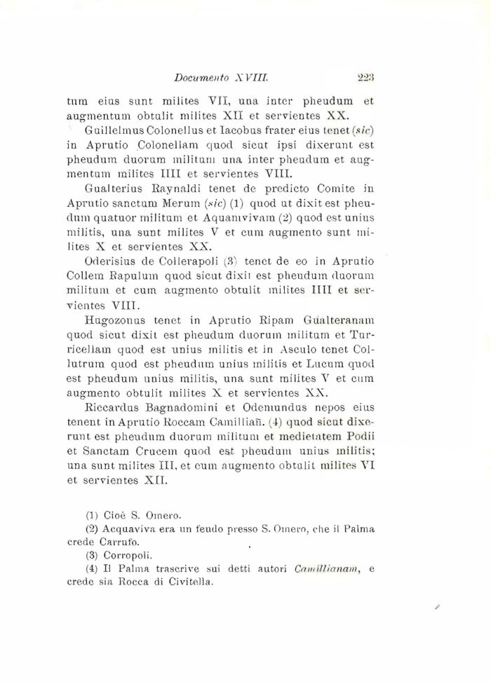Riccardus Bagnadomini et Odemundus nepos eius tenent in Aprutio Roccam Camillian. (4) quod sicut dixerunt est pheiulum duorum militum et medietatem Podii et Sanctam Crucem quod e&t pheudum unius militis; una sunt milites III. et cum augmento obtulit milites VI et servientes XII.