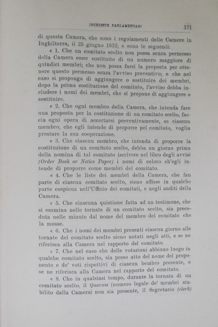 « 3. Che ciascuu membro, che intenda di proporre la costituzione di un comitato scelto, debba un giorno prima della nomina di tal comitato iscrivere nei libro degli avvisi (Order Book or Notice Paper) i nomi di coloro ch'egli intende di proporre come membri del comitato.