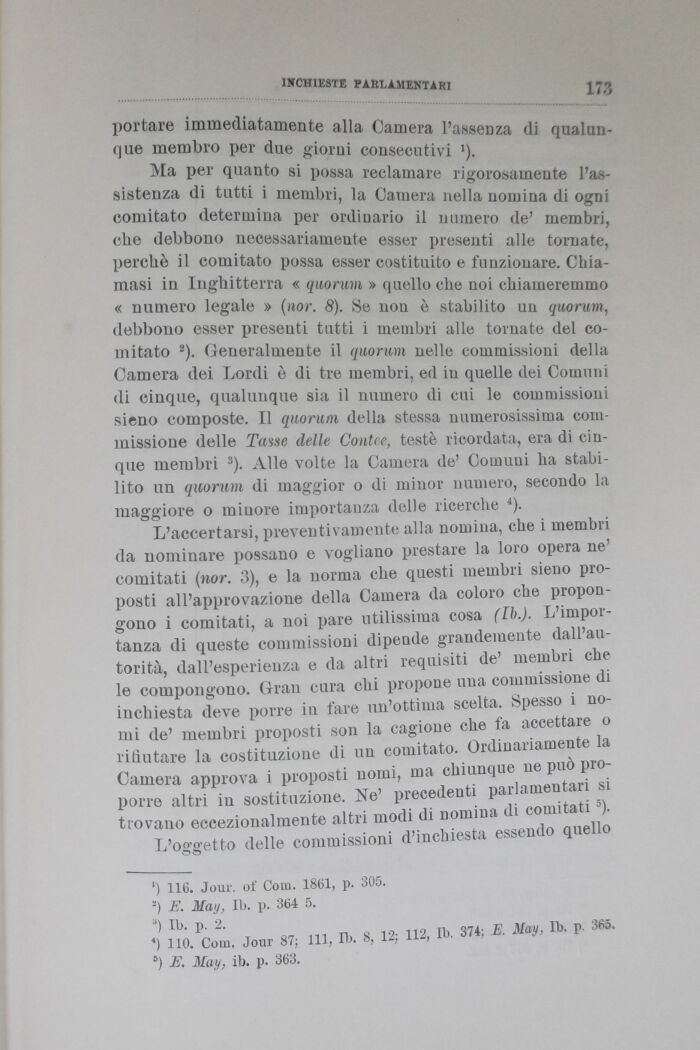 Ma per quanto si possa reclamare rigorosamente l'assistenza di tutti i membri, la Camera nella nomina di ogni comitato determina per ordinario il numero de' membri, che debbono necessariamente esser presenti alle tornate, perchè il comitato possa esser costituito e funzionare. Chiamasi in Inghitterra « quorum » quello che noi chiameremmo « numero legale » (nor. 8). Se non è stabilito un quorum, debbono esser presenti tutti i membri alle tornate del comitato 8). Generalmente il quorum nelle commissioni della Camera dei Lordi è di tre membri, ed iu quelle dei Comuni di cinque, qualunque sia il numero di cui le commissioni sieno composte. Il quorum della stessa numerosissima commissione delle Tasse delle Contee, teste ricordata, eradi cinque membri s). Alle volte la Camera de' Coinuui ha stabilito un quorum di maggior o di minor numero, secondo la maggiore o minore importanza delle ricerche 4).
