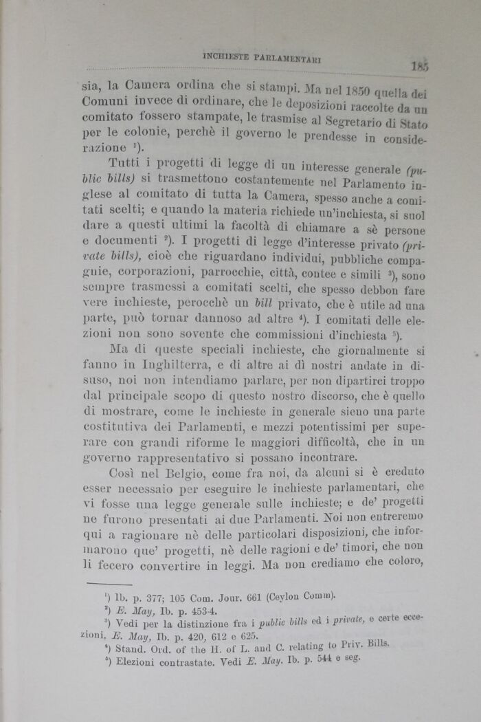 Tutti i progetti di legge di un interesse generale (public bills) si trasmettono costantemente nel Parlamento inglese al comitato di tutta la Camera, spesso anche a comitati scelti; e quando la materia richiede un'inchiesta, si suol (lare a questi ultimi la facoltà di chiamare a sè persone e documenti 9). I progetti di legge d'interesse privato (private hi Ih), cioè che riguardano individui, pubbliche compagnie, corporazioni, parrocchie, città, contee e simili 3), sono sempre trasmessi a comitati scelti, che spesso debbon fare vere inchieste, perocché un bill privato, che è utile ad una parte, può tornar dannoso ad altre 4). I comitati delle elezioni non sono sovente che commissioni d'inchiesta ).