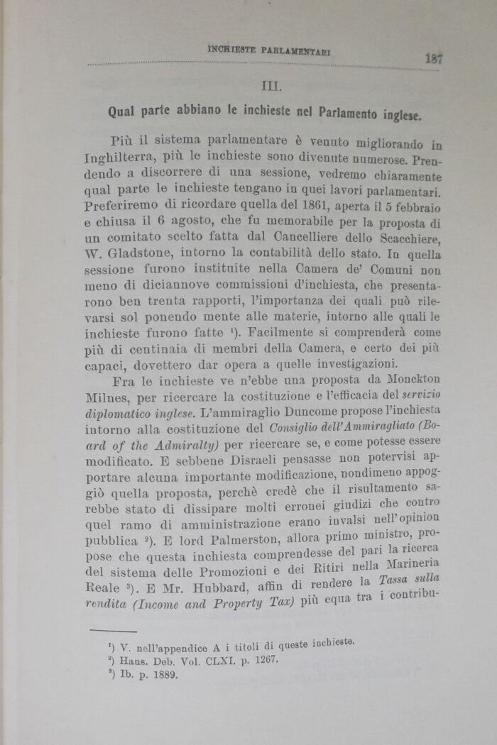 Più il sistema parlamentare è venuto migliorando in Inghilterra, più le inchieste sono divenute numerose. Prendendo a discorrere di una sessione, vedremo chiaramente qual parte le inchieste tengano in quei lavori parlamentari Preferiremo di ricordare quella del 1861, aperta il 5 febbraio e chiusa il 6 agosto, che fu memorabile per la proposta di un comitato scelto fatta dal Cancelliere dello Scacchiere W. Gladstone, intorno la contabilità dello stato. In quella sessione furono instituite nella Camera de' Comuni non meno di diciannove commissioni d'inchiesta, che presentarono ben trenta rapporti, l'importanza dei quali può rilevarsi sol ponendo mente alle materie, intorno alle quali le iucliieste furono fatte '). Facilmente si comprenderà come più di centinaia di membri della Camera, e certo dei più capaci, dovettero dar opera a quelle investigazioni.
