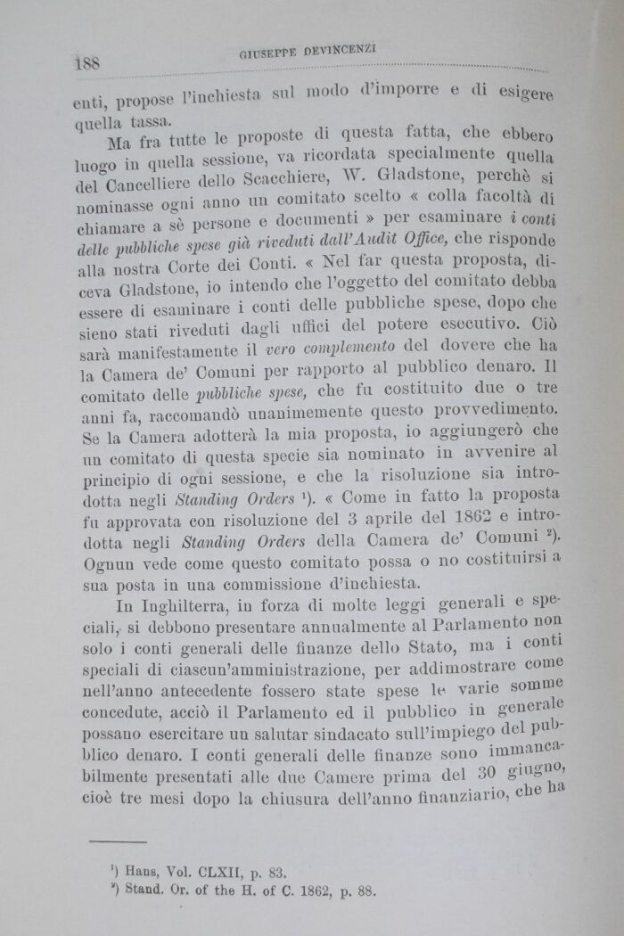 Ma fra tutte le proposte di questa fatta, che ebbero luogo in quella sessione, va ricordata specialmente quella del "cancelliere dello Scacchiere, W. Gladstone, perchè si nominasse ogni anno un comitato scelto « colla facoltà di chiamare a sò persone e documenti » per esaminare i conti delle pubbliche spese già riveduti dalVAudit Office, che rispondo alla nostra Corte dei Conti. « Nel far questa proposta, di-ceva Gladstone, io intendo che l'oggetto del comitato debba essere di esaminare i conti delle pubbliche spese, dopo che sieno stati riveduti dagli uffici del potere esecutivo. Ciò sarà manifestamente il vero complemento del dovere che ha la Camera de' Comuni per rapporto al pubbl ico denaro. Il comitato delle pubbliche spese, che fu costituito duo o tre anni fa, raccomandò uuanimemente questo provvedimento. Se la Camera adotterà la mia proposta, io aggiungerò che uu comitato di questa specie sia nominato in avvenire al principio di ogni sessione, e che la risoluzione sia introdotta negli Standing Ordtrs '). « Come in fatto la proposta fu approvata con risoluzione del 3 aprile del 1862 e introdotta negli Standing Orders della Camera de' Comuni *). Ognun vede come questo comitato possa o 110 costituirsi a sua posta in una commissione d'inchiesta.
