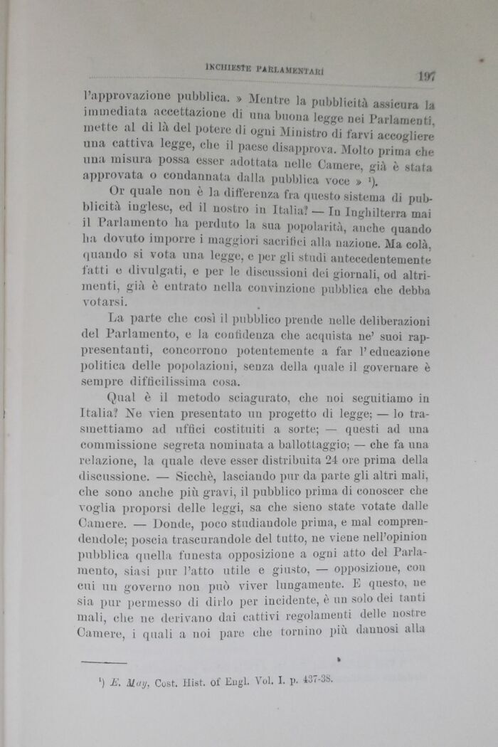Qual è il metodo sciagurato, che noi seguitiamo in Italia! Ne vien presentato un progetto di legge; lo trasmettiamo ad uffici costituiti a sorte; questi ad una commissione segreta nominata a ballottaggio; che fa una relazione, la (piale deve esser distribuita 24 ore prima della discussione. Sicché, lasciando pur da parte gli altri mali, che souo anche più gravi, il pubblico prima di conoscer che voglia proporsi delle leggi, sa che sieno state votate dalle Camere. Donde, poco studiandole prima, e mal comprendendole; poscia trascurandole del tutto, ne viene nell'opinion pubblica quella funesta opposizione a ogni atto del Parlamento, siasi pur l'atto utile e giusto, opposizione, con cui un governo non può viver lungamente. E questo, ne sia pur permesso di dirlo per incidente, è un solo dei tanti mali, che ne derivano dai cattivi regolamenti «Ielle nostre Camere, i quali a noi pare che tornino più dannosi alla