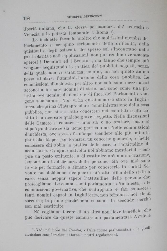 Le inchieste facendo inoltre che moltissimi membri del Parlamento si occupino seriamente delle difficoltà, delle «mistioni e degli ostacoli, che spesso sol s'incontrano nelle particolarità e nelle applicazioni, non pur rendono veramente operosi i Deputati ed i Senatori, ma fanno che sempre più vengano acquistando la pratica de' pubblici negozii9 senza della quale non vi saran mai uomini, cui con quieto animo possa affidarsi l'amministrazione della cosa pubblica. Le commissioni d'inchiesta per altro non solo sono mezzi assai acconci a formare uomini di stato, ma sono come una palestra ove uomini di dentro e di fuori del Parlamento vengono a misurarsi. Non vi ha quasi uomo di stato in Inghilterra, che prima d'intraprendere l'amministrazione della cosa pubblica, non si sia fatto conoscere nei comitati scelti costituiti a ricercare qualche grave soggetto. Nelle discussioni delle Camere si conosce se uno sia o no oratore, ma mal si può giudicare se sia uomo pratico o no. Nelle commissioni d'inchiesta, ove spesso fa d'uopo scendere alle più minute particolarità per poi formarsi un concetto generale, è facile conoscere chi abbia la pratica delle cose, o l'attitudine di acquistarla. Or ogni qualvolta noi abbiamo mestieri di riempire un posto eminente, o di costituire un'amministrazione, lamentiamo la deficienza delle persone. Ma ove mai sono le vie per formarle, o almeno per conoscerle in Italia! Sovente noi dobbiamo riempiere i più alti uffici dello stato a caso, senza neppur sapere l'attitudine delle persone che prescegliamo. Le commissioni parlamentari d'inchiesta, e le commissioni governative, che sviluppano e fan conoscere tanti uomini capaci in Inghilterra, non offrono a noi alcun soccorso; le prime perchè non vi sono, le seconde perchè son mal costituite.