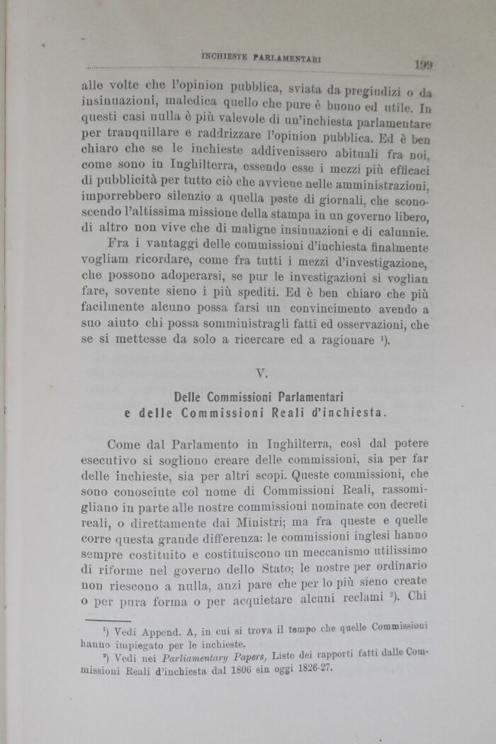Fra i vantaggi delle commissioni d'inchiesta finalmente vogliam ricordare, come fra tutti i mezzi d'investigazione, che possono adoperarsi, se pur le investigazioni si voglian fare, sovente sieno i più spediti. Ed è ben chiaro che più facilmente alcuno possa farsi un convincimento avendo a suo aiuto chi possa somministragli fatti ed osservazioni, che se si mettesse da solo a ricercare ed a ragiouare ').