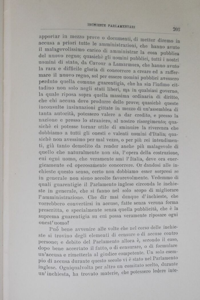 apportar in mezzo prove o documenti, di metter diremo in accusa a priori tutte le amministrazioni, che hanno avuto il malagevolissimo carico di amministrar la cosa pubblica del nuovo regno; quasiché gli uomini pubblici, tutti i nostri uomini di stato da Cavour a Lamarmora, che hanno avuto la rara e difficile gloria di concorrere a creare ed a raffermare il nuovo regno, sol per essere uomini pubblici avessero perduto quella comune guarentigia, che ha sin l'infimo cittadino non solo negli stati liberi, n^a in qualsiasi governo, la quale riposa sopra quella massima ordinaria di diritto, che chi accusa deve produrre delle prove; quasiché queste inconsulte insinuazioni gittate in mezzo di un'assemblea di tanta autorità, potessero valere a dar credito, e presso la nazione e presso lo straniero, al nostro risorgimento; quasiché ci potesse tornar utile di sminuire la riverenza che dobbiamo a tutti gli onesti e valenti uomini d'Italia; quasiché non avessimo per mal vezzo, o per più rei intendimenti, già tanto demolito da render anche più malagevole di quello che naturalmente non sia, l'opera della costruzione, cui ogni uomo, che veramente ami l'Italia, deve ora euer-gicamente ed operosamente concorrere. Or dandosi alle inchieste questo senso, certo non dobbiamo esser sorpresi se iu generale non sieno accolte favorevolmente. Vedemmo di quali guarentigie il Parlamento inglese circonda le inchieste in generale, che si fanno nel solo scopo di migliorare l'amministrazioue. Che dir mai dunque d'inchieste, che vorrebbero convertirsi in accuse, fatte senza veruna forma prescritta, e specialmente senza quella pubblicità, che è la suprema guarentigia su cui possa veramente riposare ogni onest' uomo!