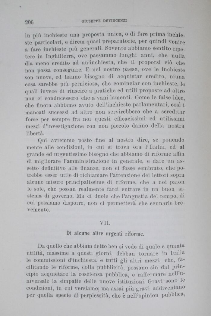 in più inchieste ima proposta unica, o di fare prima inchieste particolari, e direni quasi preparatorie, per quindi venire a fare inchieste più generali. Sovente abbiamo sentito ripotere in Inghilterra, ove passammo lunghi anni, che nulla dia meno credito ad un'inchiesta, che il proporsi ciò che non possa conseguire. E nel nostro paese, ove le inchieste son nuove, ed hanno bisogno di acquistar credito, ninna cosa sarebbe più perniciosa, che cominciar con inchieste, lo quali invece di riuscire a pratiche ed utili proposte ad altro non ci conducessero che a vani lamenti. Como le false idee, che finora abbiamo avuto dell'inchieste parlamentari, così i mancati successi ad altro non servirebbero che a screditar forse per sempre fra noi questi efficacissimi ed utilissimi mezzi d'investigazione cou non piccolo danno della nostra libertà.