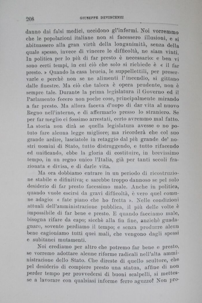 Ma ora dobbiamo entrare in un periodo di ricostruzione stabile e difiuitiva; e sarebbe troppo dauuoso se pel solo desiderio di far presto facessimo male. Anche in politica, quando vuole escirsi da gravi difficoltà, è vero quel comune adagio: « fate piano che ho fretta ». Nelle condizioni attuali dell'amministrazione pubblica, il più delle volte è impossibile di far bene e presto. E quando facciamo male, bisogna rifare da capo; sicché alla tiu fine, anziché guadagnare, sovente perdiamo il tempo; e senza produrre alcun bene cagioniamo tutti quei mali, che vengono dagli spessi e subitanei mutamenti.