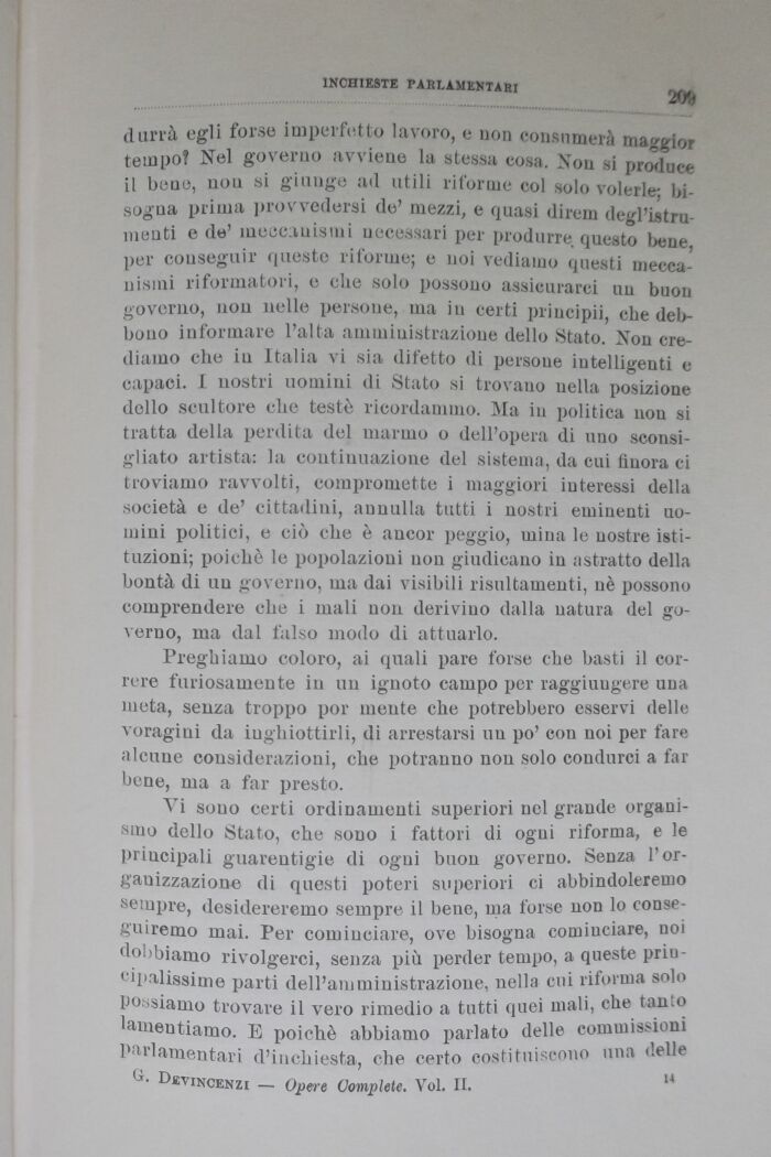 Vi souo certi ordinamenti superiori nel grande organismo dello Stato, che souo i fattori di ogui riforma, e le principali guarentigie di ogni buon governo. Senza l'organizzazione di questi poteri superiori ci abbindoleremo sempre, desidereremo sempre il bene, ina forse non lo conse guiremo mai. Per cominciare, ove bisogna cominciare, noi dobbiamo rivolgerci, senza più perder tempo, a queste priu-«ipalissime parti dell'amministrazione, nella cui riforma solo possiamo trovare il vero rimedio a tutti quei mali, che tanto lamentiamo, E poiché abbiamo parlato delle commissioni Parlamentari d'inchiesta, che certo costituiscono una delle g. Devincenzi Opere Complete. Voi. ii. 14