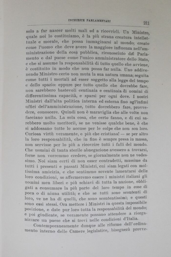 solo a far nascer molti mali ed a ricovrirli. Un Ministro quale noi lo costituiamo, è la più strana creatura intellettuale e morale, che possa immaginarsi al mondo; creato come l'uomo che deve avere la maggiore influenza nell'amministrazione della cosa pubblica, riconosciuto difl Parlamento e dal paese come l'unico amministratore dello Stato e che si assume la responsabilità di tutto quello che avviene! ò costituito in modo che non possa far nulla. Uno addivenendo Ministro certo non muta la sua natura umana; seguita come tutti i mortali ad esser soggetto alla legge del tempo e dello spazio: eppure per tutto quello che dovrebbe fare, non sarebbero bastevoli centinaia e centinaia di uomini di dPerentissima capacità, e sparsi per ogui dove. I nostri Ministri dall'alta politica interna ed esterna fino agl'infimi uffici dell'amministrazione, tutto dovrebbero fare, provvedere, conoscere. Quindi non è maraviglia che alle volte non facciano nulla. La sola cosa, che certo fanno, e di cui sarebbero molto meri torii, se ne venisse qualche bene, è che si addossano tutte le accuse per le colpe che non son loro. Curiosa virtù veramente, e più che cristiana! se per altro la loro responsabilità, che in fiue è sempre presa in massa, non servisse per lo più a ricovrire tutti i falli del mondo. Che uomini di tanta sterile abnegazione avessero a trovarsi, forse non vorremmo credere, se giornalmente non ne vedessimo. Noi siam certi di non esser contradetti, massime da tutti i presenti e passati Ministri, cui siam legati con moltissima amicizia, e che sentimmo sovente lamentarsi delle loro condizioni, se affermeremo essere i ministri italiani gli uomini men liberi e più schiavi di tutta la nazione, obbligati a consumare la più parte del loro tempo iu cose di poca o di ninna utilità; e che se tutti sono scontenti di loro, ve ne ha di quelli, che sono scontentissimi; e questi sono essi stessi. Ora mettere i Ministri in questa impossibile posizione, e date pur loro tutta la responsabilità del mondo; e poi giudicate, se veramente possano attendere a riorganizzare un paese che si trovi nelle condizioni d'Italia.