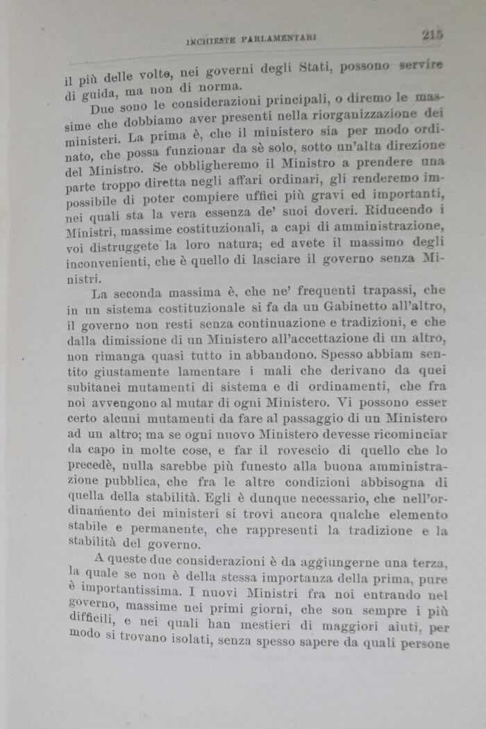 inisteri La prima è, che il ministero sia per modo ordirlo cbe possa funzionar da sè solo, sotto un'alta direzione del Ministro. Se obbligheremo il Ministro a prendere fina parte troppo diretta negli affari ordinari, gli renderemo impossibile di poter compiere uffici più gravi ed importanti, nei quali sta la vera essenza de' suoi doveri. Kiducendo i Miniatri, massime costituzionali, a capi di amministrazione, voi distruggete la loro natura; ed avete il massimo degli inconvenienti, che è quello di lasciare il governo senza Ministri.
