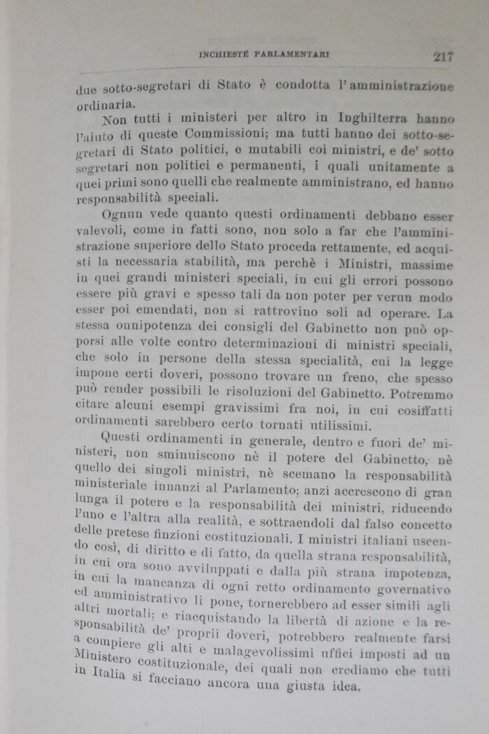 Questi ordinamenti in generale, dentro e fuori de' ministeri, non sminuiscono nò il potere del Gabinetto, nè quello dei singoli ministri, nè scemano la responsabilità ministeriale innanzi al Parlamento; anzi accrescono di gran lunga il potere e la responsabilità dei ministri, riducendo l'uno e l'altra alla realità, e sottraendoli dal falso concetto delle preteso finzioni costituzionali. I ministri italiani uscen-così, di diritto e eli fatto, da quella strana responsabilità, 1,1 cui ora sono avviluppati e dalla più strana impotenza, ed 1111 ' " ,nancanzft ^ ogni retto ordinamento governativo u amministrativo li pone, tornerebbero ad esser simili agli " 11 moi'tali; e riacquistando la libertà di azione e la re-" >P<>u.sabilità de' proprii doveri, potrebbero realmente tarsi e malagevolissimi uffici imposti ad un in ImT° costituzi°nale, dei quali non crediamo che tutti a si facciano ancora una giusta idea.