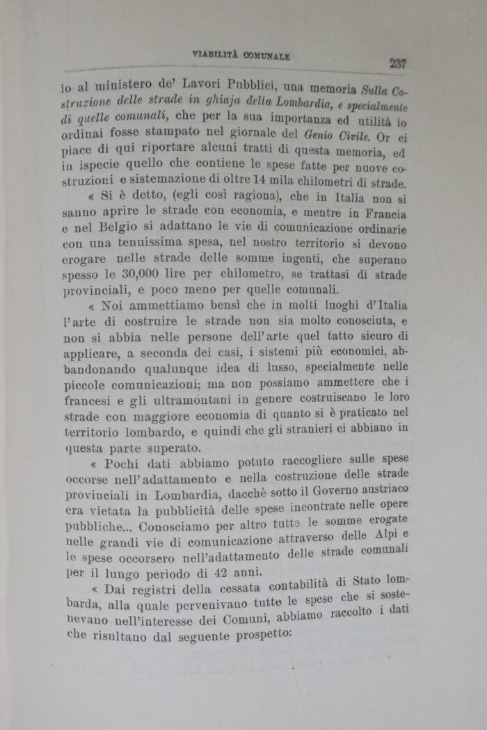 « Pochi flati abbiamo potuto raccogliere sulle spese occorse nell'adattamento e nella costruzione delle strade provinciali in Lombardia, dacché sotto il Governo austriaco era vietata la pubblicità delle spese incontrate nelle opere pubbliche... Conosciamo per altro tutta le somme erogate nelle grandi vie di comunicazione attraverso delle Alpi e le spese occorsero nell'adattamento delle strade comunali per il lungo periodo di 42 anni.