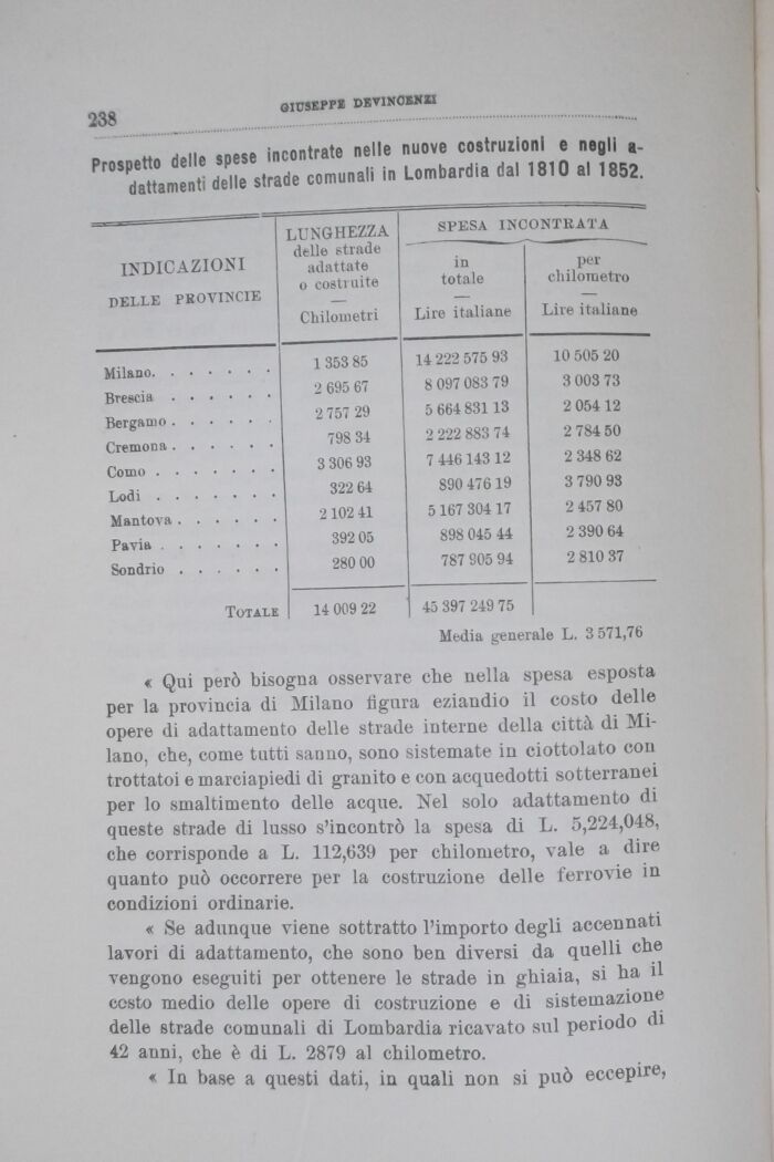 « Se adunque viene sottratto l'importo degli accennati lavori di adattamento, che sono ben diversi da quelli che vengono eseguiti per ottenere le strade in ghiaia, si ha il costo medio delle opere di costruzione e di sistemazione delle strade comunali di Lombardia ricavato sul periodo di 42 anni, che è di L. 2879 al chilometro.