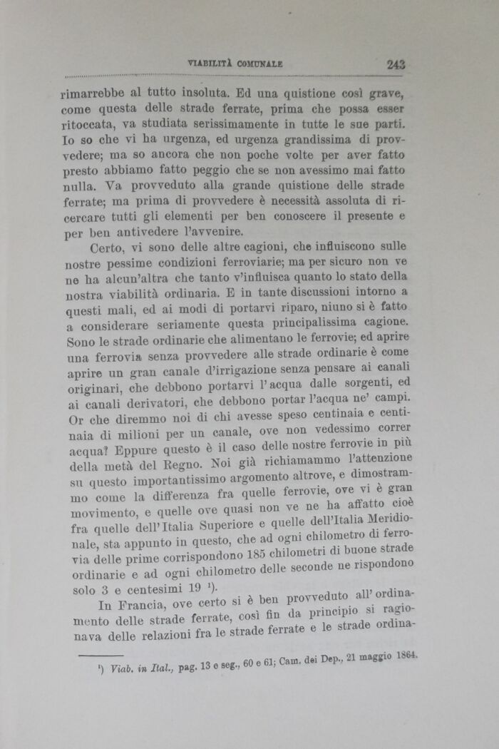 Certo, vi sono delle altre cagioni, che influiscono sulle nostre pessime condizioni ferroviarie; ma per sicuro non ve no ha alcun'altra che tanto v'influisca quanto lo stato della nostra viabilità ordinaria. E in tante discussioni intorno a questi mali, ed ai modi di portarvi riparo, niuno si è fatto a considerare seriamente questa priucipalissima cagione. Sono le strade ordinarie che alimentano le ferrovie; ed aprire una ferrovia senza provvedere alle strade ordinarie è come aprire un gran canale d'irrigazione senza pensare ai canali originari, che debbono portarvi l'acqua dalle sorgenti, ed ai canali derivatori, che debbono portar l'acqua ne' campi. Or che diremmo noi di chi avesse speso centinaia e centinaia di milioni per un canale, ove non vedessimo correr acquai Eppure questo è il caso delle nostre ferrovie in più della metà del Regno. Noi già richiamammo l'attenzione su questo importantissimo argomento altrove, e dimostrammo come la differenza fra quelle ferrovie, ove vi è gran movimento, e quelle ove quasi non ve ne ha affatto cioè fra quelle dell'Italia Superiore e quelle dell'Italia Meridionale, sta appunto iu questo, che ad ogni chilometro di ferrovia delle prime corrispondono 185 chilometri di buone strade ordinarie e ad ogni chilometro delle seconde ne rispondono