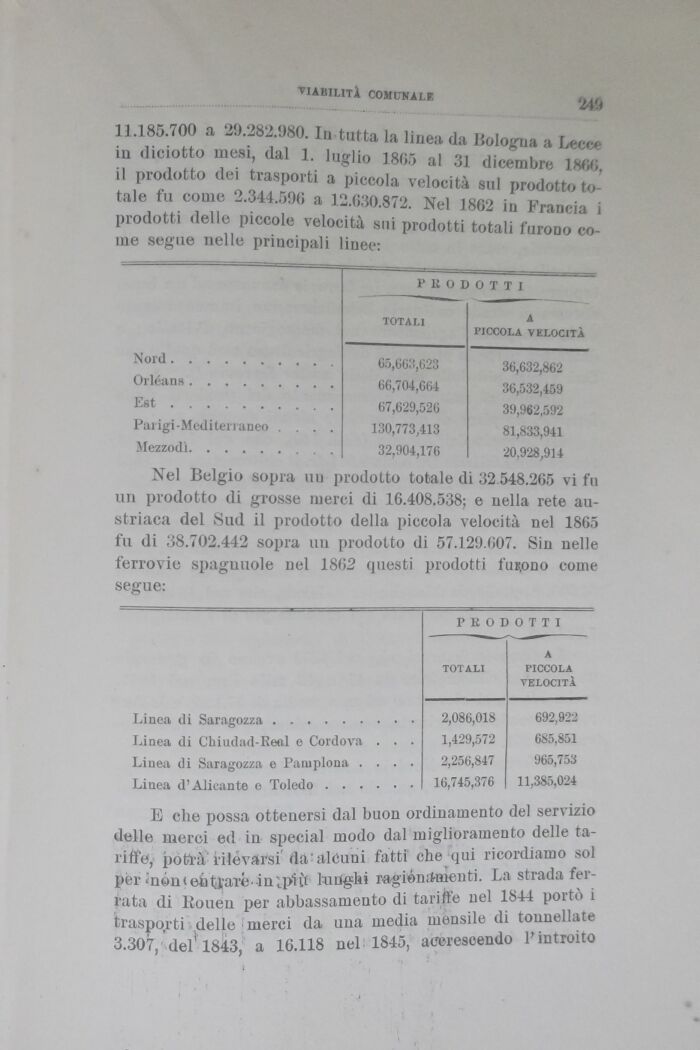 11.185.700 a 29.282.980. In tutta la linea da Bologna a Lee., in diciotto mesi, dal 1. luglio 1805 al 31 dicembre 1 m\ il prodotto dei trasporti a piccola velocità sul prodotto totale fu come 2.344.596 a 12.630.872. Nel 1862 in Francia i prodotti delle piccole velocità sui prodotti totali furono come segue nelle principali linee: